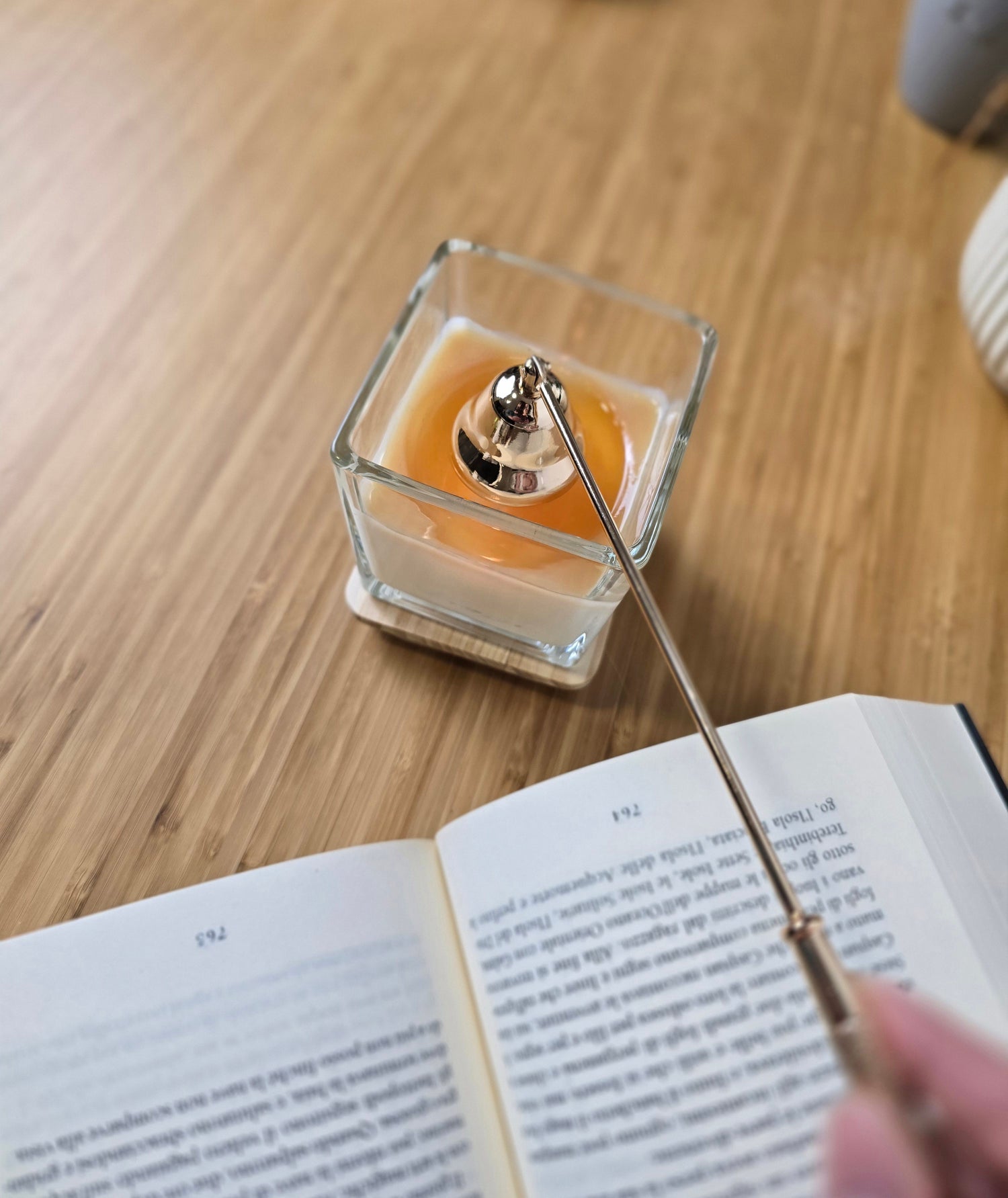 Per spegnere la candela senza produrre fumo, puoi utilizzare uno spegnifiamma per soffocare la fiamma in modo elegante e sicuro. In alternativa, soffia delicatamente e lascia che il fumo si disperda prima di coprirla con il coperchio in legno per preservare il profumo.